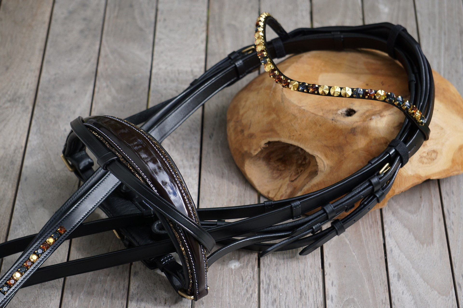 An Genick- und Nasenriemen extra weich unterlegter Trensenzaum, wahlweise Blank- oder Lackleder. Aus hochwertigem Leder mit schwedischem Reithalfter und Wunsch-Stirnriemen. Der anatomische Nasenriemen ist dick gepolstert. Die Farben der Steine mit Fassung können frei gewählt werden. Die Lieferung erfolgt mit Zügeln, ohne Gebiss.